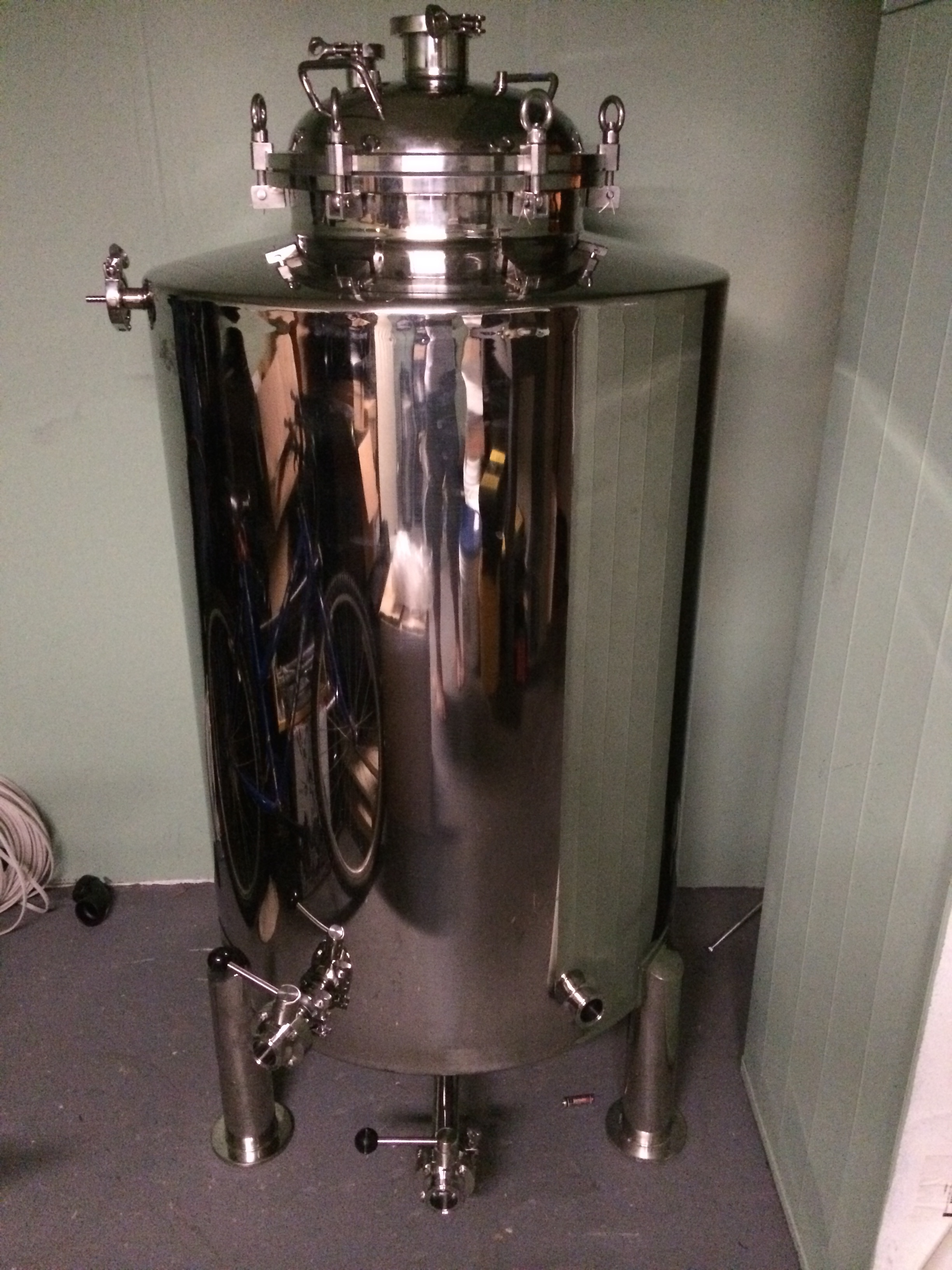 From the fermentation side we are now pushing the beer to our other new purchase, a 3 barrel brite tank. This is housed in our walk in cooler (cooled with an AC unit and a Coolbot). This is giving us a faster and cleaner carbonation. We can keg and bottle directly off the brite tank which is much better for consistency and ease of use.